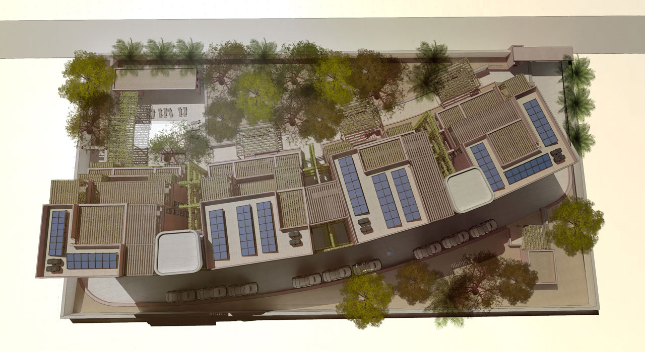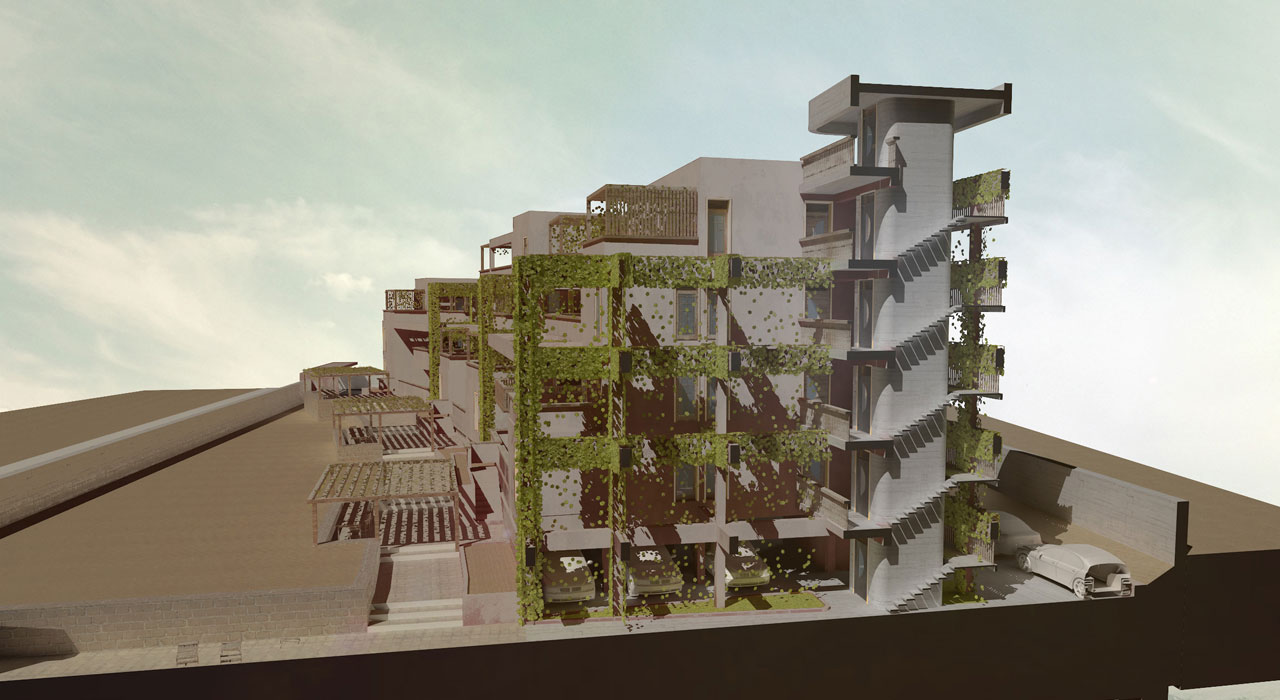 The proposed design – not realized – was to keep a small footprint for the building, in order to save the gardens as much as possible, and provide a lush green backdrop for the apartments with beautiful shaded recreation areas and a swimming pool. This means that parking has been sunk into a half-basement.