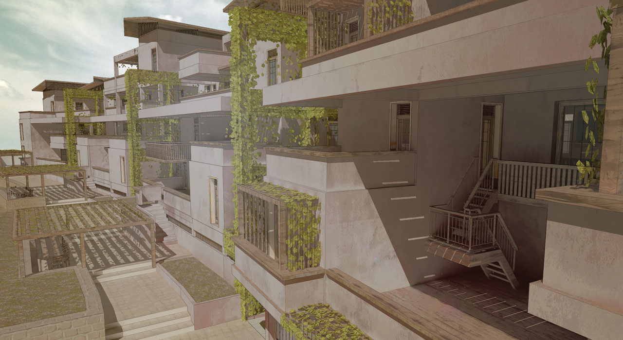The client expressed the wish to make the apartment building as quaint and friendly as possible, and to avoid massiveness. The design responds to this by cutting up the building into three semi-detached towers, linked by open staircase and elevators. The towers themselves are being articulated by protruding and recessing volumes of different height, with abundant terraces, balconies and loggias that are to be overgrown with climbers and plants.