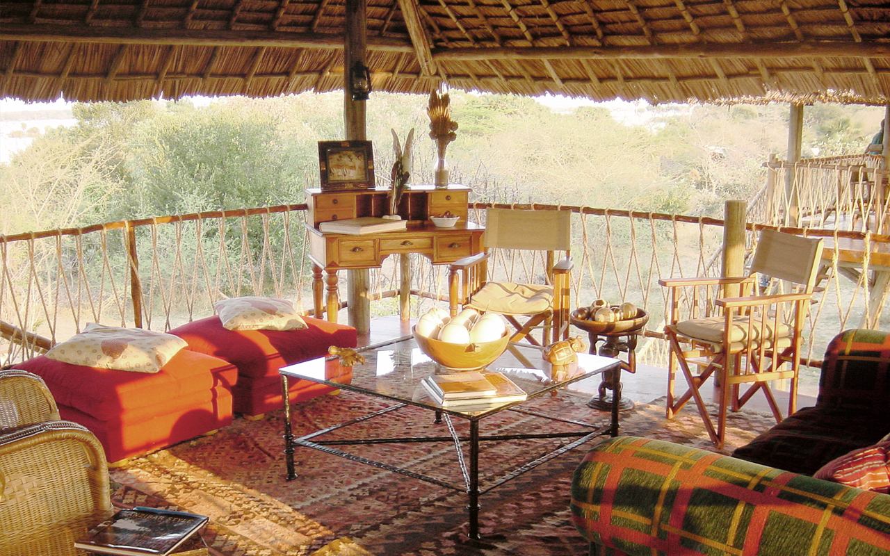 The lounge and dining hall are entirely constructed out of timber, bamboo and thatch and also lifted on raised platforms, overlooking the landscape..